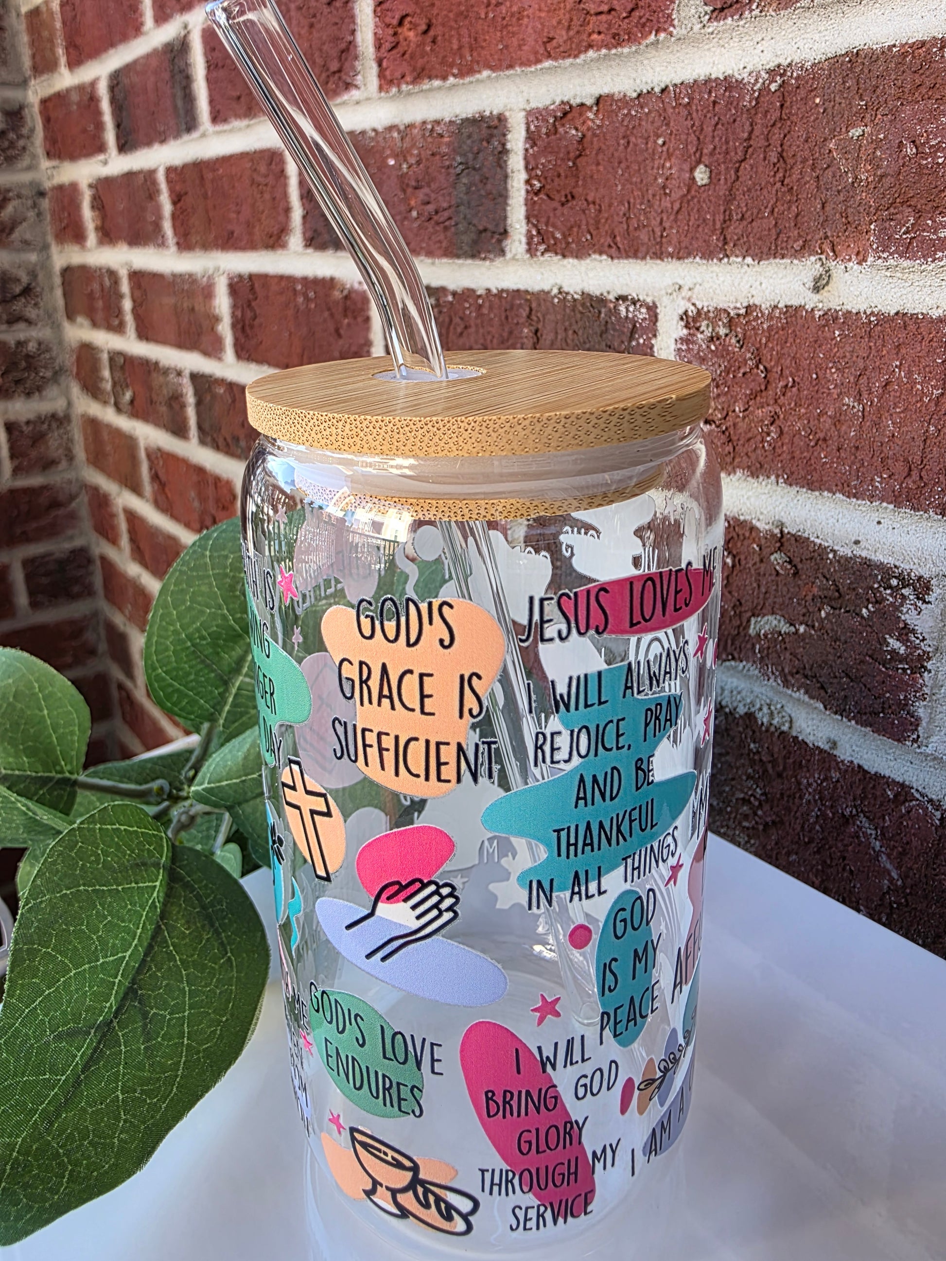 Start each day with purpose and peace. This 16oz can glass features a bamboo lid, glass straw, and a beautiful wrap inspired by faith-filled affirmations. Perfect for morning coffee, tea, or a quiet moment of reflection. Let every sip be a reminder of God's promises.