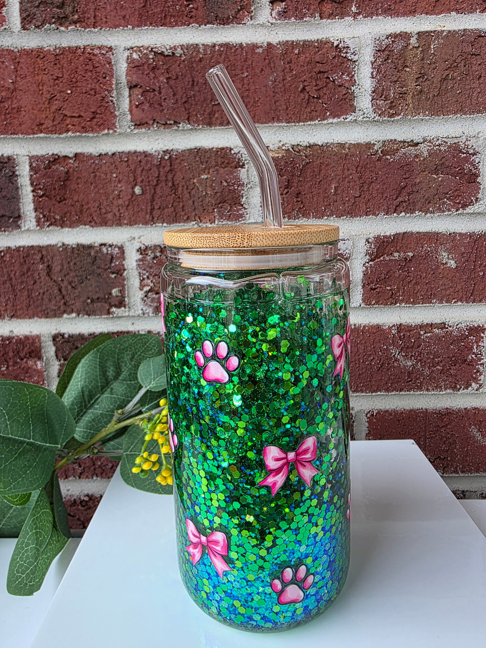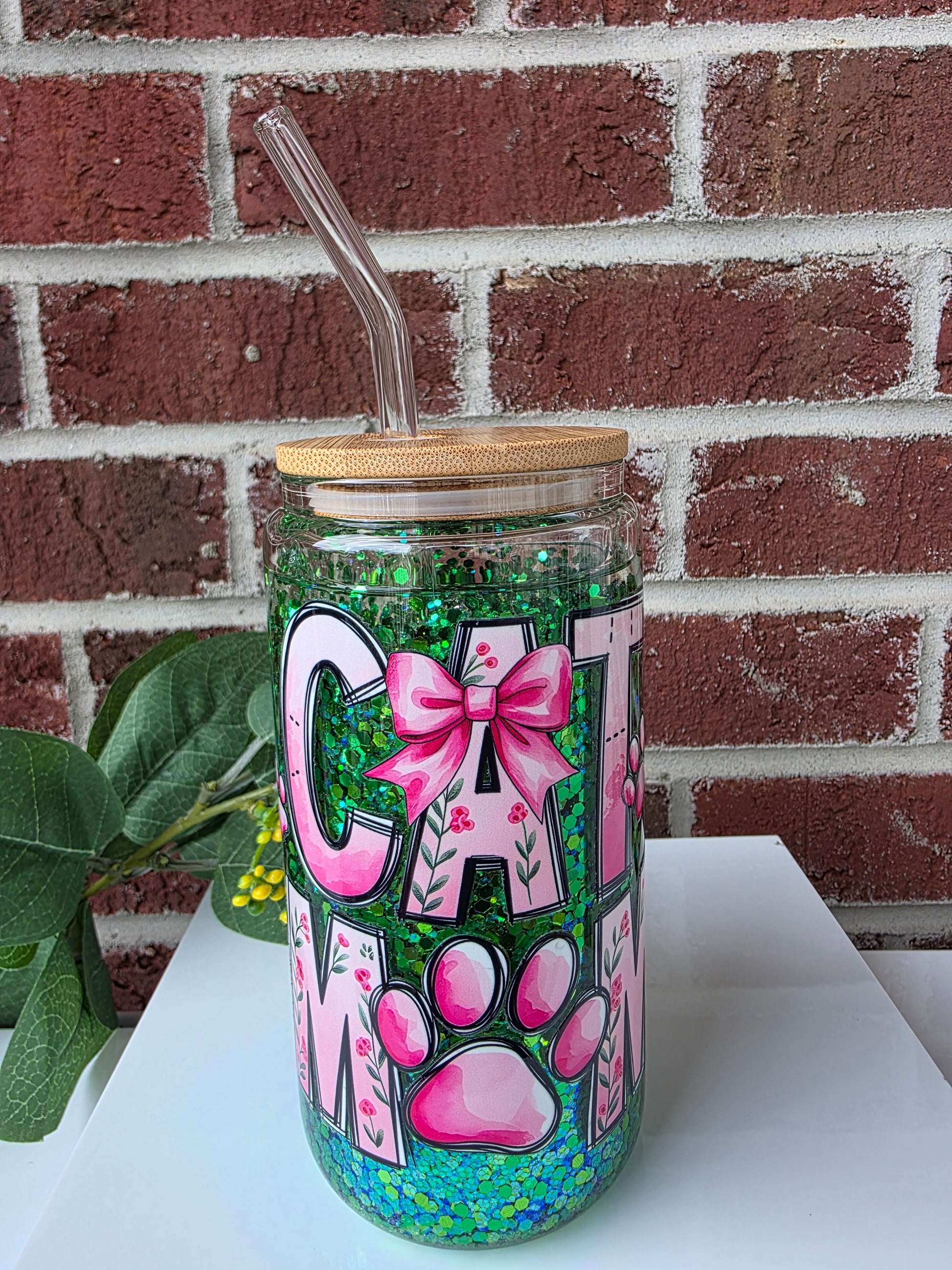 Show off your feline-loving flair with our 12 oz “Cat Mom” Snow Globe Glass Cup – the ultimate drinkware for proud pet parents! This charming can-shaped glass cup features vibrant pink “Cat Mom” lettering, sparkling green glitter that swirls like kitty magic, and an adorable accent bow for that extra touch of cute.
