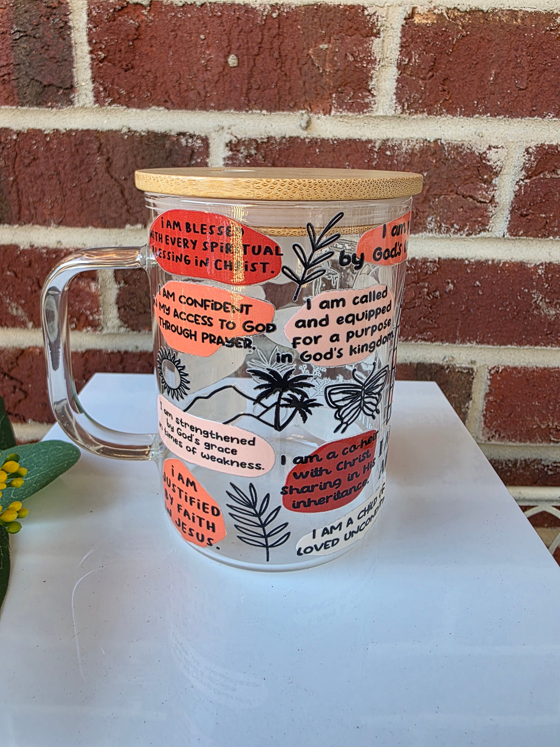 Sip in faith and confidence with our “I Am in Christ” Affirmation Cup. This 15 oz glass cup with a bamboo lid and reusable straw is a daily reminder of who you are in Him — loved, chosen, redeemed, and strong. Perfect for your morning coffee, tea, or smoothie, it’s more than a cup — it’s a statement of faith and identity.