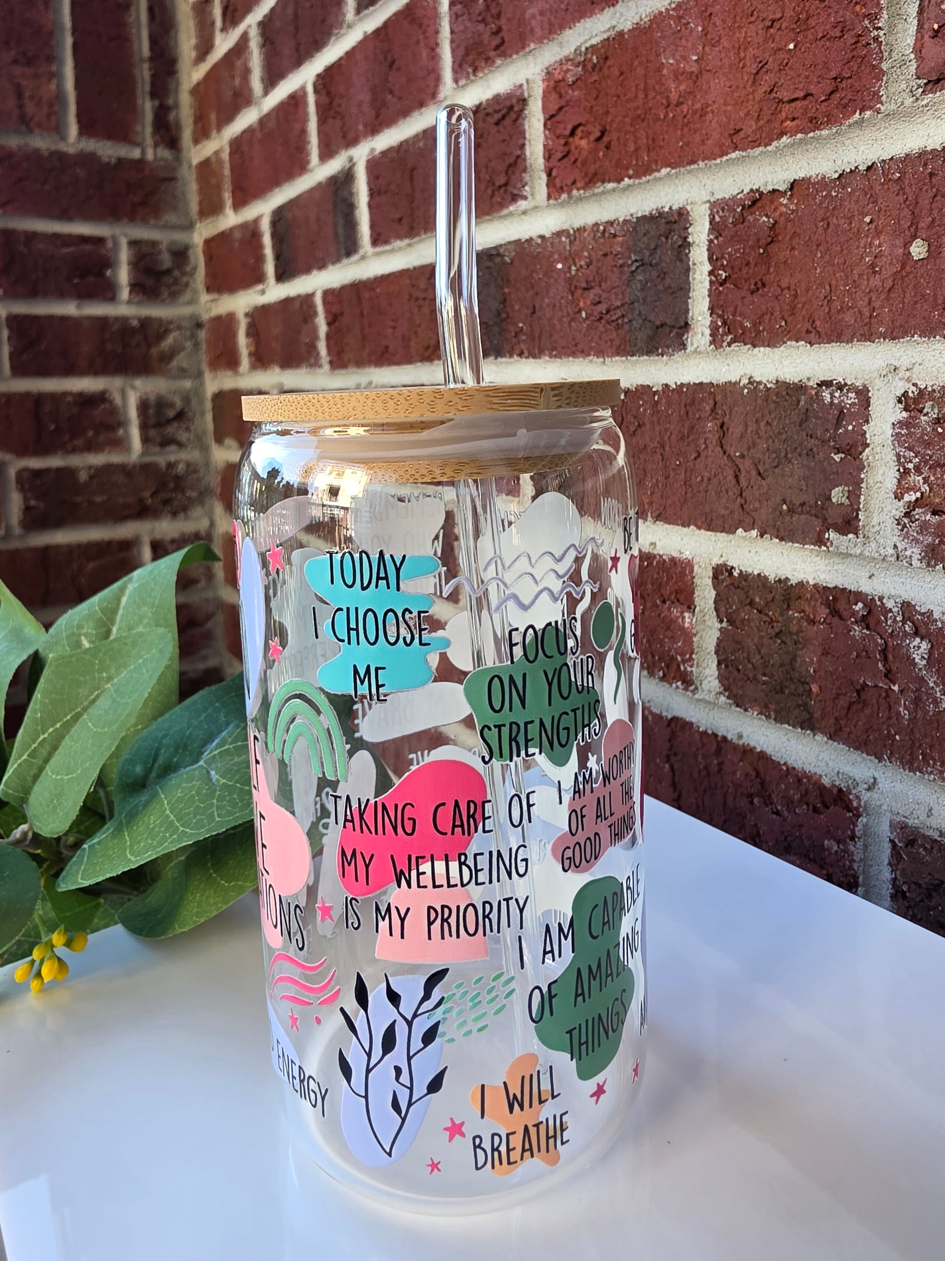 Pour into yourself — one sip at a time. This 16oz can glass features a bamboo lid, glass straw, and an inspiring wrap filled with gentle affirmations to remind you of your worth, strength, and beauty. Perfect for morning rituals, journaling moments, or any time you need a little inner peace. Because loving yourself is the first step to everything.