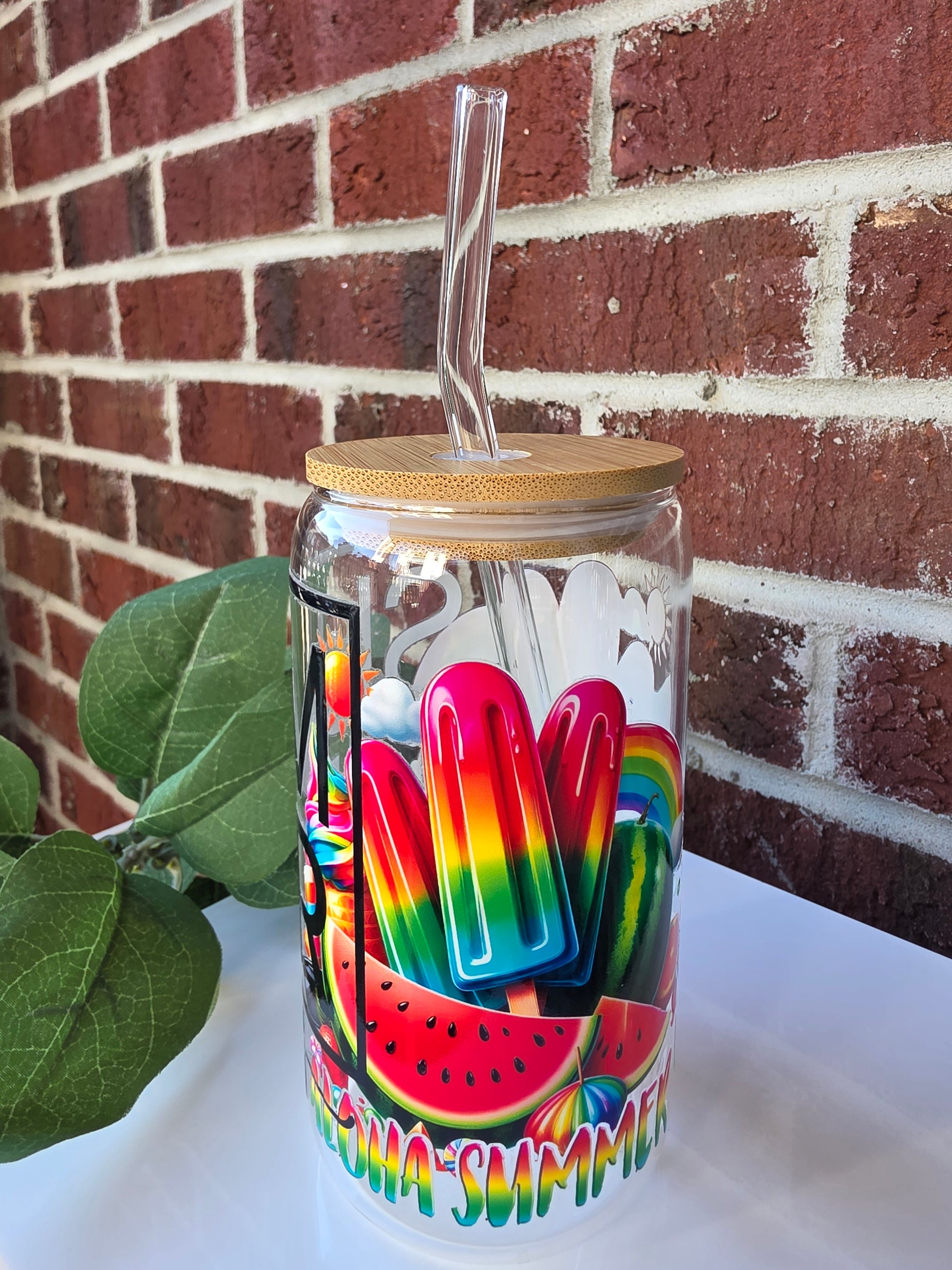 Sip into sunshine with this bold and colorful 16oz can glass — featuring a bamboo lid, glass straw, and a wrap bursting with summer energy. Perfect for iced drinks, poolside sips, beach days, or backyard hangs. Bright, fun, and totally Instagrammable.