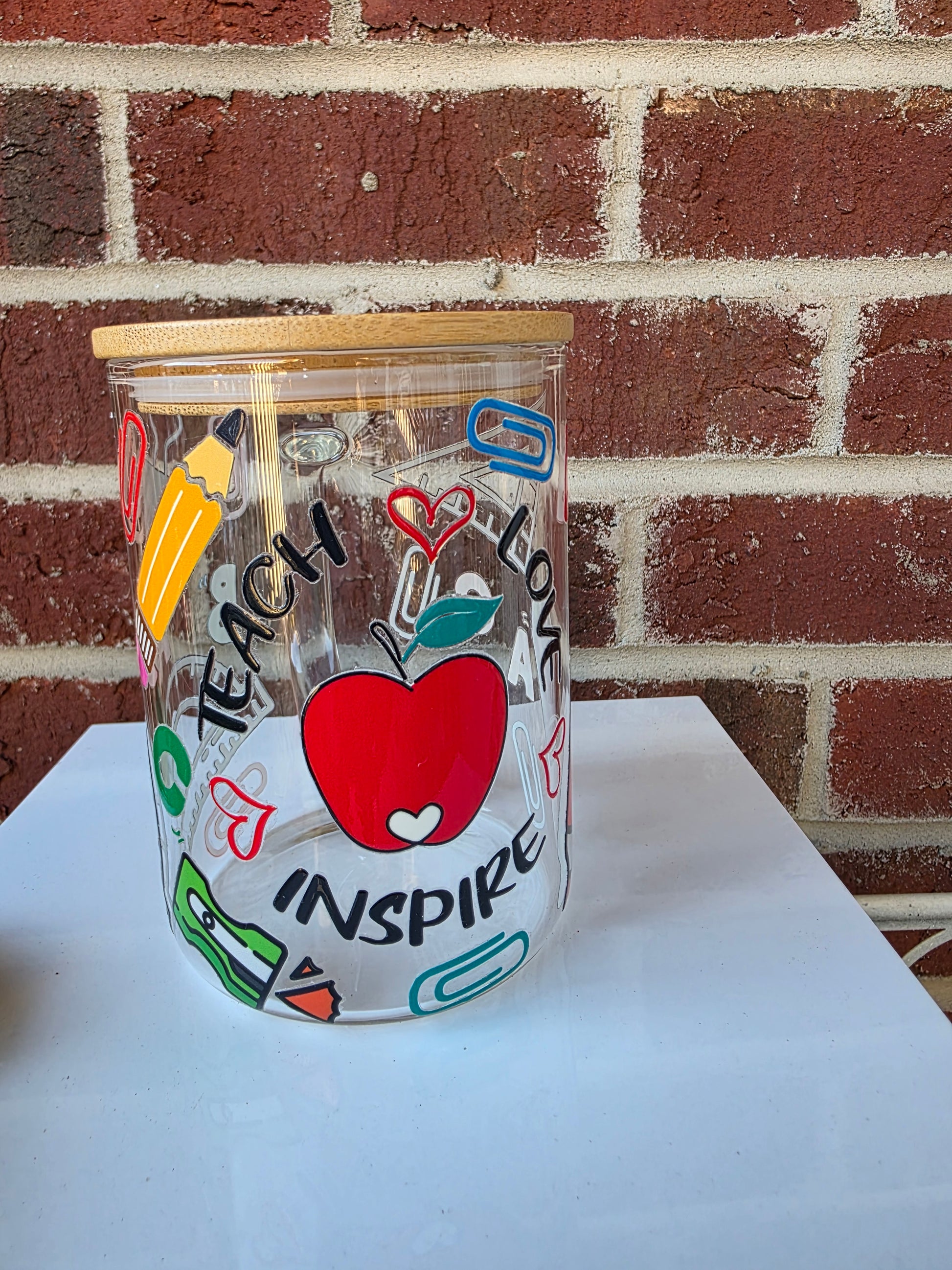 For the teacher who leads with love and inspires every heart — our “Teach, Love, Inspire” 15 oz glass cup is a tribute to your daily dedication. Crafted from durable glass with a natural bamboo lid and straw, it’s perfect for morning coffee, afternoon tea, or an iced pick-me-up that keeps you motivated all day long.
